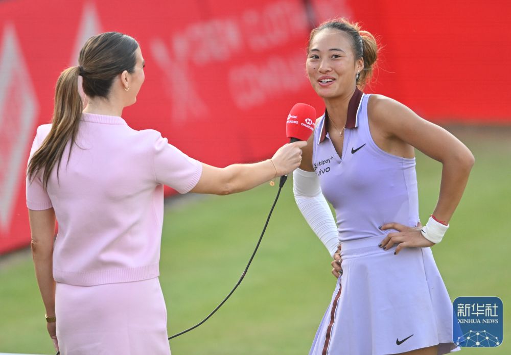 ↑郑钦文(右)在比赛后接受采访。新华社发(刘颖摄)